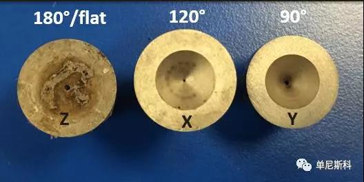 入口角對毛細口模入口處熔體的流動規律有影響。進口角較低的模具,減少了再循環角渦的形成,降低了口模進口的不穩定流動和能耗。較低的角度有利于剪切流動,降低了聚合物熔體的彈性變形。單尼斯科提供了60°(W)、90°(Y)、120°(X)、180°(Z)四種入口角度的毛細管口模,下圖為三種不同入口角度的口模。