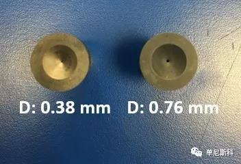 口模直徑對流變儀剪切速率的適用范圍有影響。單尼斯科提供的毛細管口模直徑從0.3mm到3.00 mm不等,也就是說,流變儀能夠產生0.02到277000不等的剪切速率。通常直徑為0.75-1.5mm的毛細管口模提供的剪切速率與擠出或注射成型過程中的剪切速率相匹配。較大直徑的口模具產生較低的剪切速率,并減少入口壓降、滑移、拉伸變形和模具膨脹。下圖顯示了兩個直徑不同的口模。