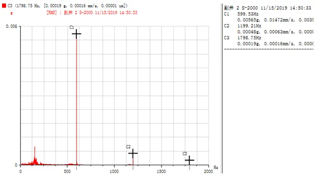 由圖 7、8 可知,振動的主頻率中沒有軸承故障特征頻率,表明軸承運行狀態良好,未出現故障。但是在水平和垂直方向的頻譜圖中,都發現 600 Hz 頻率及其倍頻成分,且該頻率成分的幅值zui高,其對應的是 2 倍的 SCR (全波整流可控硅故障特征頻率)。在頻譜圖中出現此頻率,說明電控系統出現故障,導致提升機運行速度不穩,與前面測試的速度圖可以相互印證。