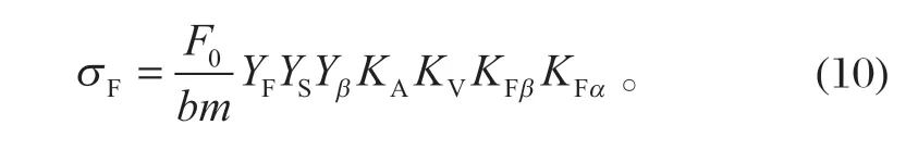 式中:YF 為齒廓系數,YF=1;YS 為應力修正系數,YS=1;KA 為使用系數,KA=1.25;KV 為動載系數,KV=1;KFβ 為螺旋分布系數,KFβ=1;KFα 為載荷分布系數,KFα=1。將各數據代入式(10),可得齒根彎曲應力為100.42MPa。
