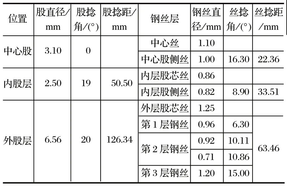 從表2 可以看出,鋼絲繩主要分為 3 層,中 心股、內(nèi)股和外股;3 股的直徑不同,并且股捻距也存在一定的差異。在進行仿真求解時,需要對各個層進行定義。